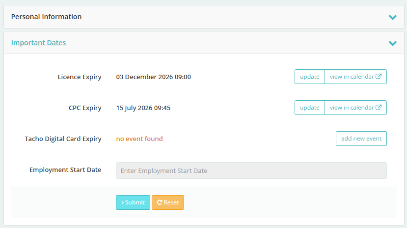 It would be good practice to upload your Drivers / Employee >Personal Information > Important Dates
