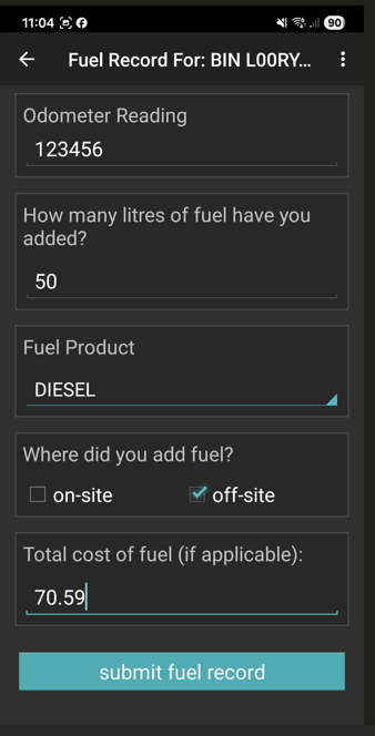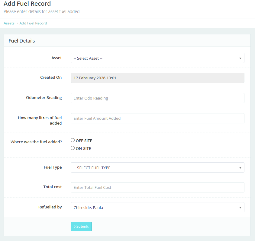 Vehicles/Assets > Fuel administration> Add Fuel Record